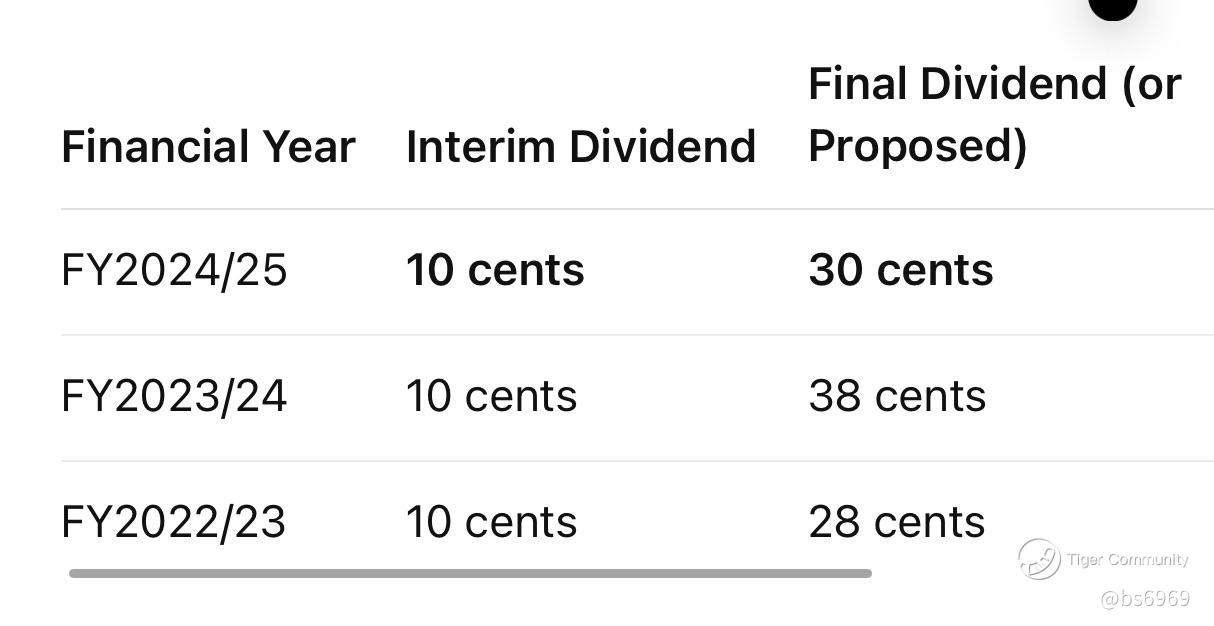 • The proposed final dividend for FY2024/25 is 30 cents one-tier per share, and there was an interim dividend of 10 cents.