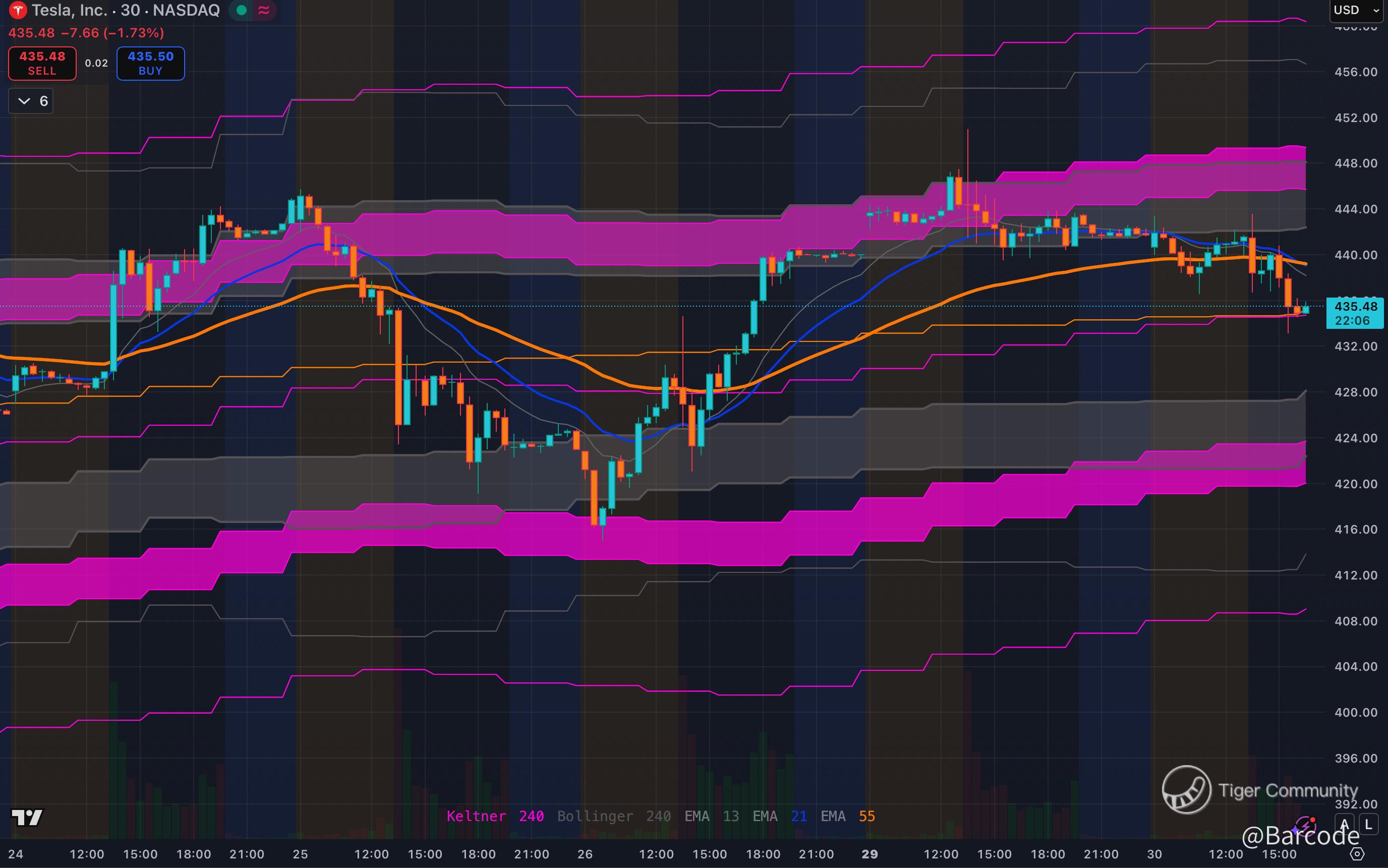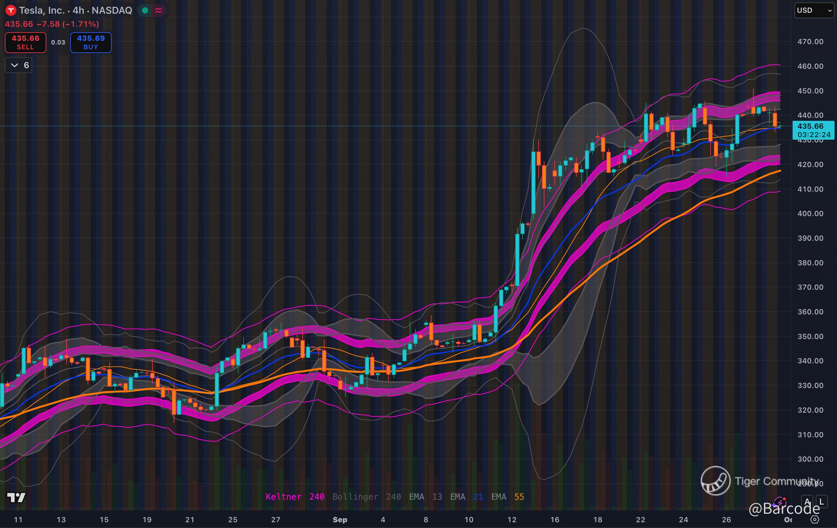 On the 4H view, $TSLA has been riding the Keltner midline since early September, but RSI is rolling off highs. If we see a mean reversion reset, $405–$415 aligns with the lower Keltner band and the breakout shelf. That’s the “healthy correction” pocket that keeps the bigger structure intact while cooling down stretched momentum.