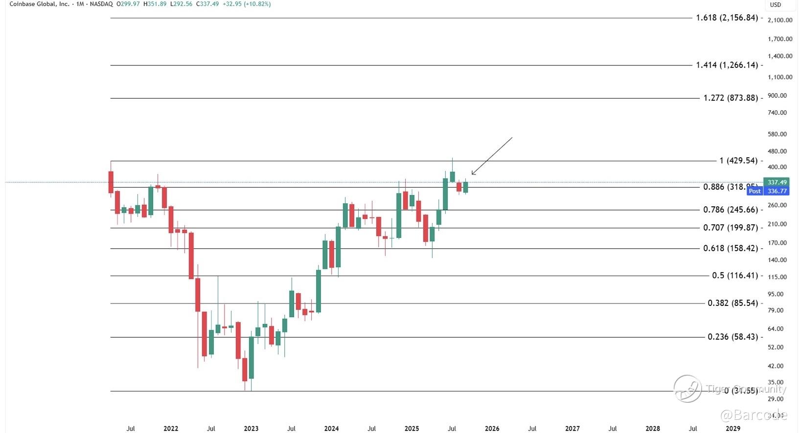 Yesterdayโs monthly close carried major weight. $COIN closed above the 0.886 Fibonacci retracement at $318, printing a bullish engulfing candle that historically favours strong continuation. This sets the stage for a probability-weighted path higher into the next Fibonacci extension levels.
