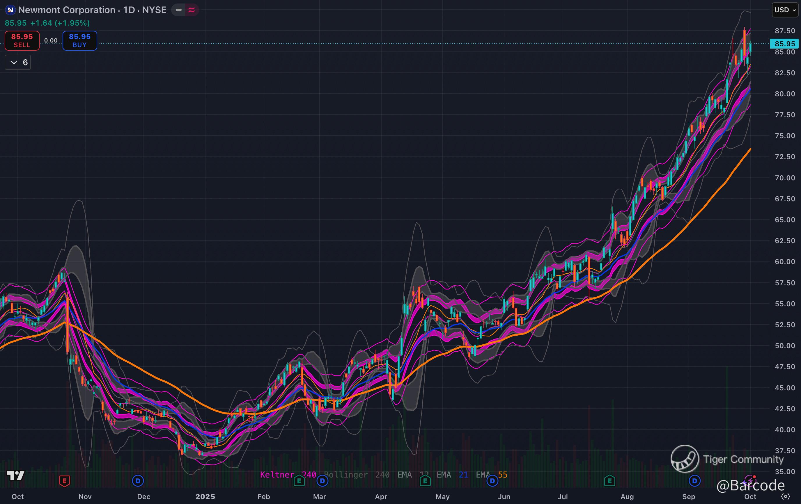 Newmont is pushing $85.95 with textbook EMA alignment (13 > 21 > 55). Central banks are buyers of last resort, diversifying reserves out of dollars and into gold. Newmont’s cash flows balloon at current spot prices, setting up a retest of $90 and a run at $100 as gold breaks to new highs.