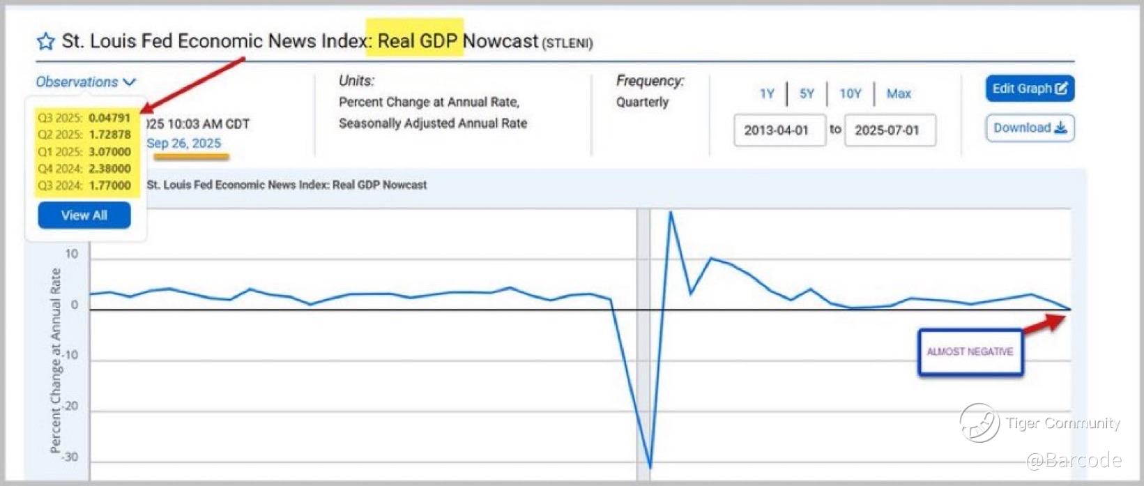 The U.S. economy is standing at a breaking point. The St. Louis Fed’s Real GDP Nowcast for Q3 2025 is barely positive at 0.05%; effectively zero. Beneath the surface, the Chapwood Index shows inflation in double digits across U.S. cities, confirming what households already know: official CPI is fiction. Real rates are deeply negative, the dollar is depreciating against real assets, and we’ve quietly entered an emerging-market style recession.