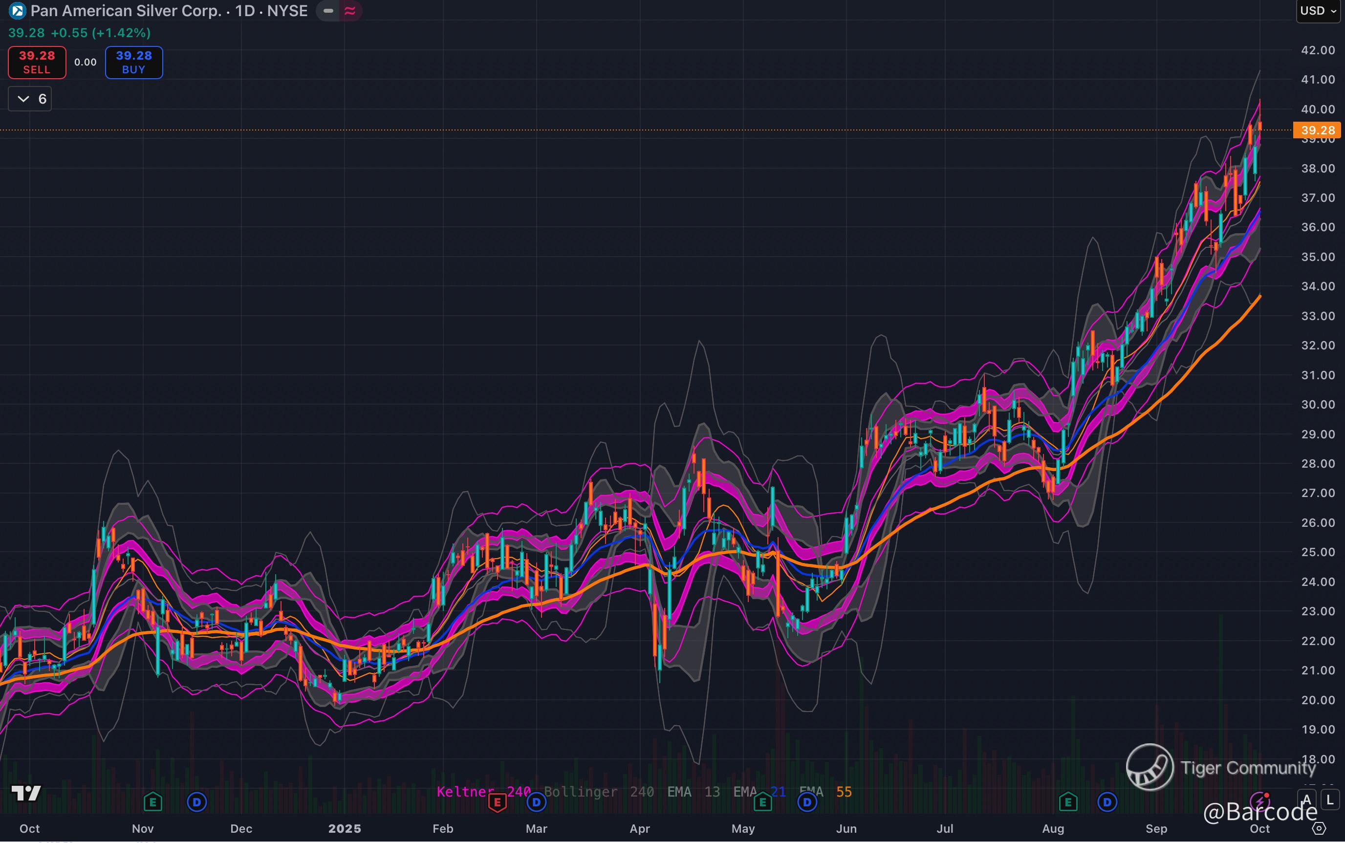 Pan American is breaking higher at $39.28, hugging the top of its Bollinger and Keltner channels. The chart screams momentum: rising volume, aligned EMAs, and higher lows since July. Silver is historically the high-beta cousin of gold; when monetary debasement accelerates, silver’s moves are sharper and faster. Upside zones: $42.50 first, then $48 if momentum persists.