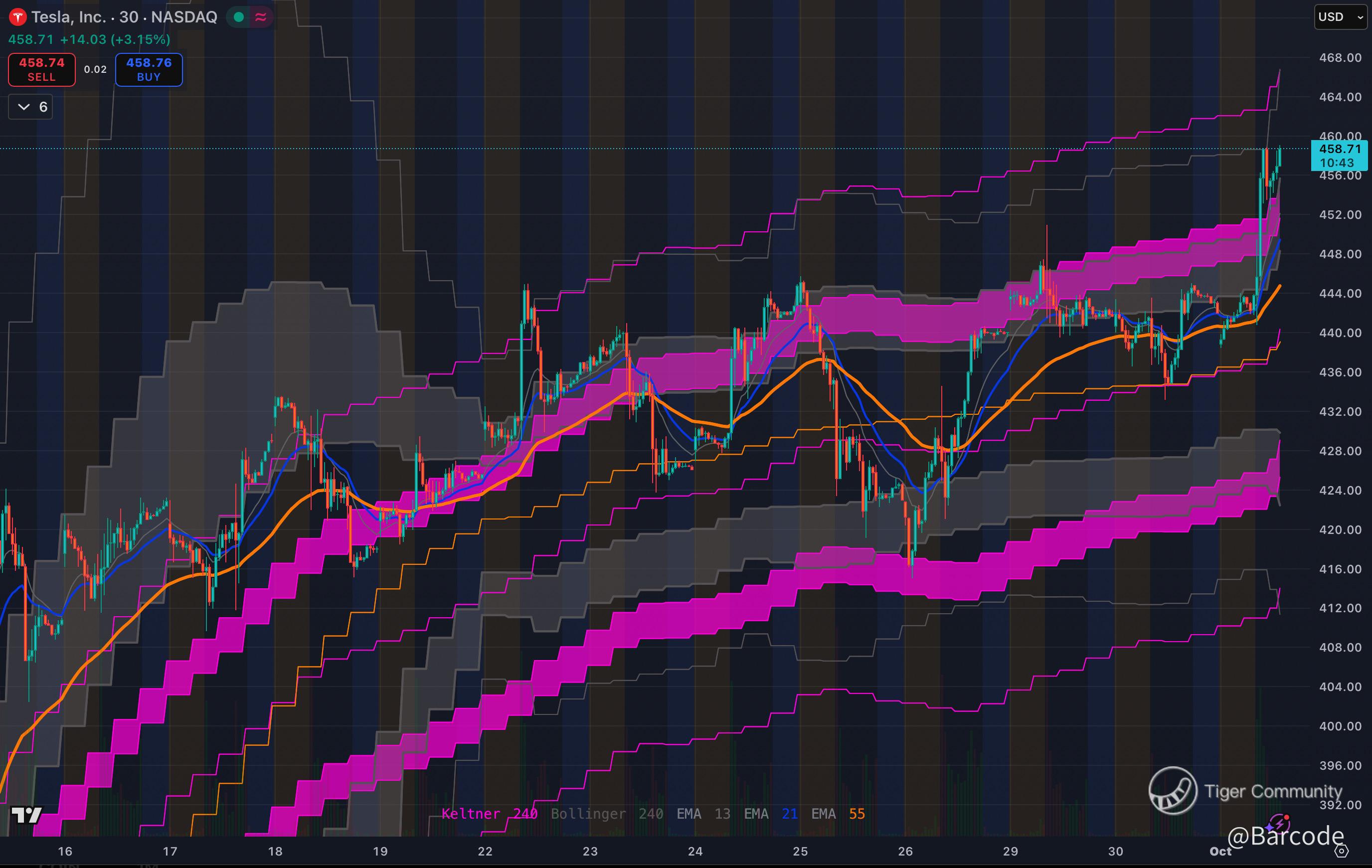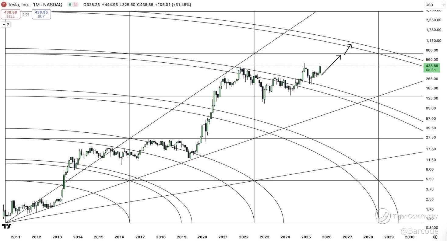 Tesla broke above $450 with conviction. On Gann arcs, price has cleared the consolidation band; geometry projects acceleration toward $700–$1,000. $458–$460 is now the short-term pivot, supported by stacked EMAs and widening Keltner/Bollinger bands.
