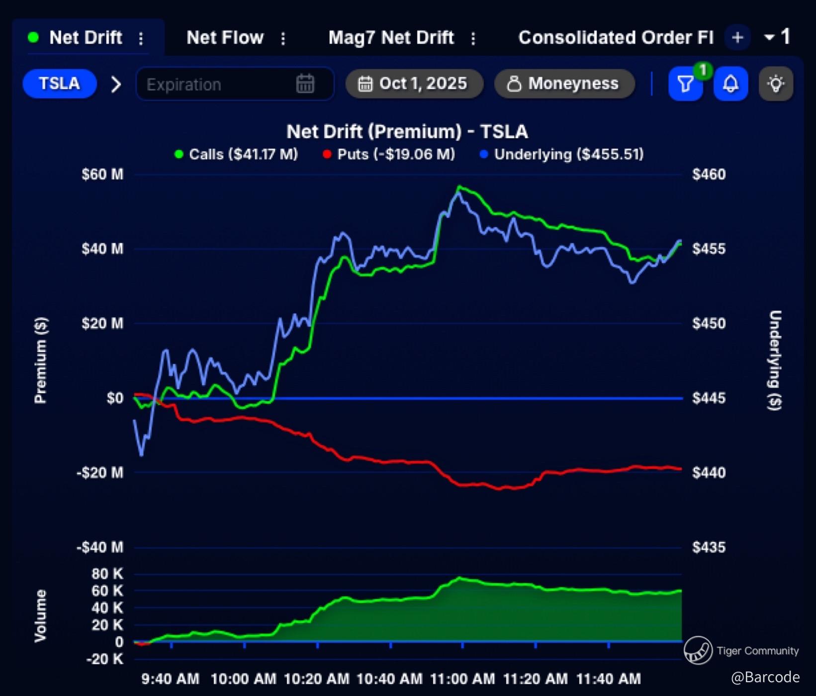 Today’s tape was dominated by $41M+ in single-leg calls bought and $18M+ in puts sold. That’s bullish drift at scale, with shares punching through $455.