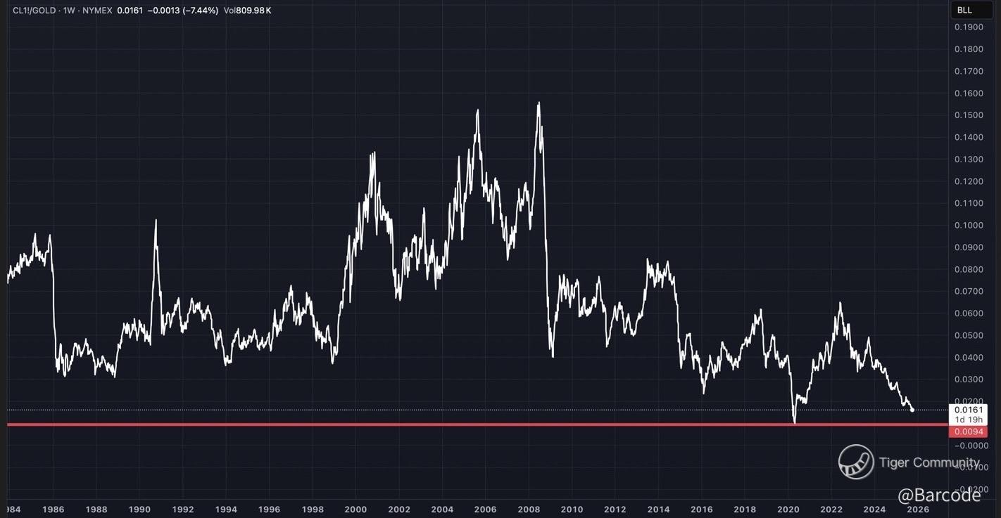 I’m seeing one of the most remarkable commodity divergences in decades. Outside of brief COVID dislocations, oil and copper have never been this cheap compared with gold. Historically, this ratio only reaches such extremes during wars, crises, or market dysfunction. Yet today, we’re seeing it in a supposedly “normal” market environment.