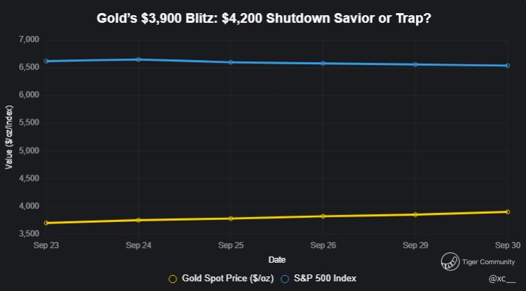 Gold futures have shattered records, surging to $3,900/oz amid a 5.4% weekly gain, as U.S. government shutdown odds hit 85% on Kalshi, driving safe-haven flows. The S&P 500 dipped to 6,540 after three days of losses, with Nasdaq at 22,000 steady, underscoring a flight to metals. UBS’s $4,200 target by mid-2026, citing geopolitical and economic uncertainty, adds fuel. Could this momentum blast to $4,200? Will gold outshine risk assets this year? Gold or silver—which has the edge? Dive into the rally, assess the drivers, and strategize your position in this precious metal powerhouse.