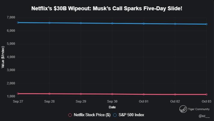 Musk’s Trigger: Posts found on X show his “Cancel Netflix for the health of your kids” call, tied to content disputes, sparking a 2.3% drop on October 1.