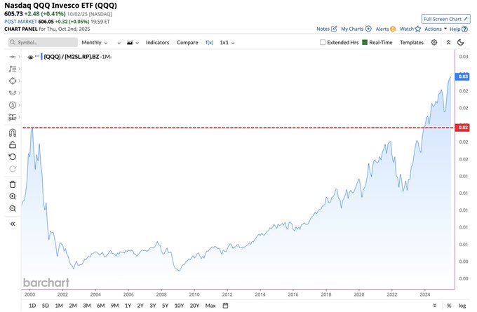 1.Nasdaq $Invesco QQQ(QQQ)$ relative to M2 Money Supply 🚨 Dot Com Bubble vs. Now 🤯