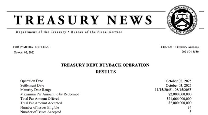 3.U.S. Treasury buys back another $2 Billion of their own debt 🤯 This makes for a total buyback this week of $4.9 Billion 👀