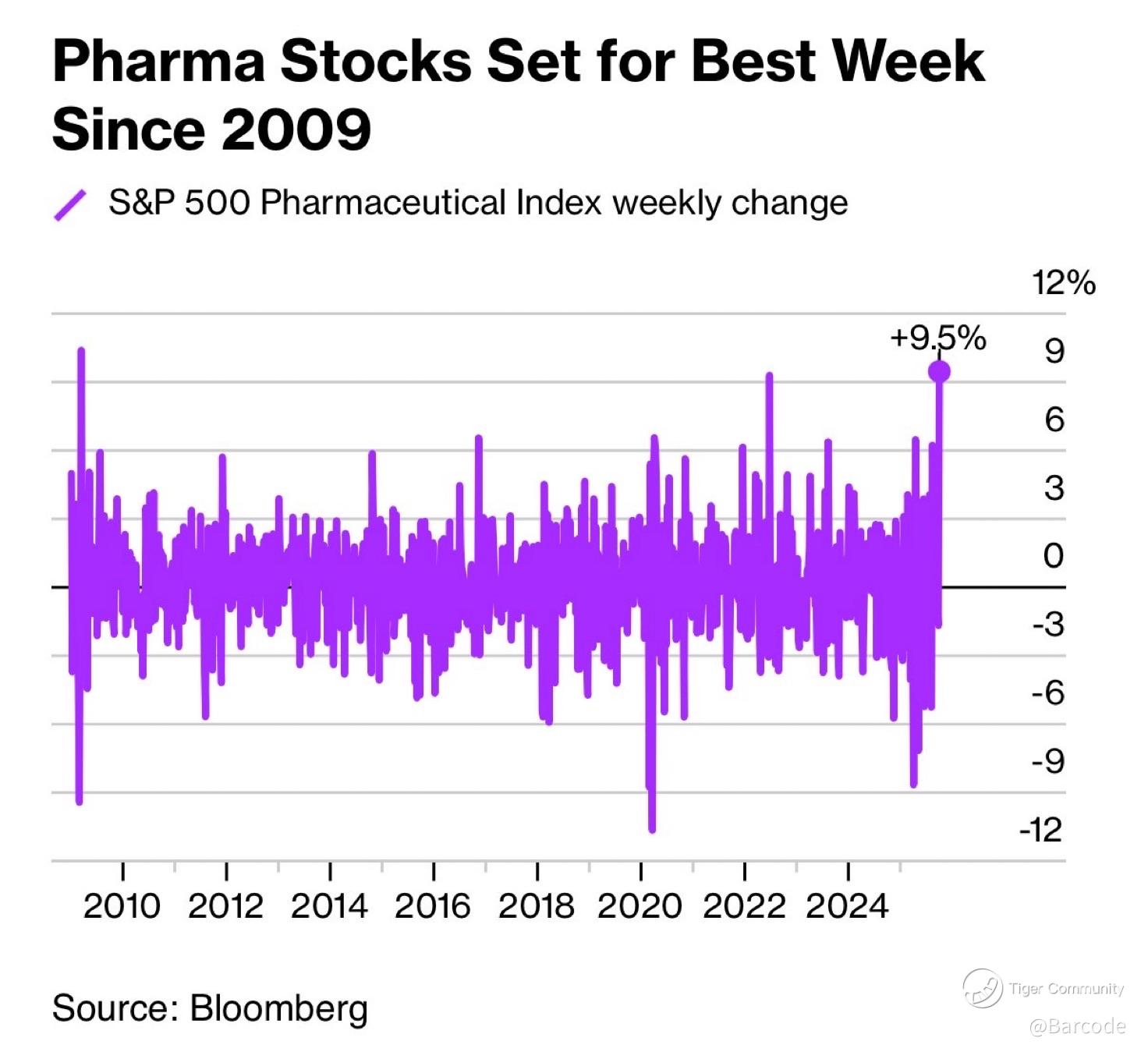 European doctors have just recommended Novo Nordisk ($NVO) and Eli Lilly’s weight-loss drugs as first-line obesity treatments, accelerating the GLP-1 demand story that has already transformed pharma’s earnings outlook. Against this backdrop, the S&P 500 Pharmaceutical Index is tracking a +9.5% weekly gain, the largest since 2009, signalling that the sector is moving as one, not in isolation.