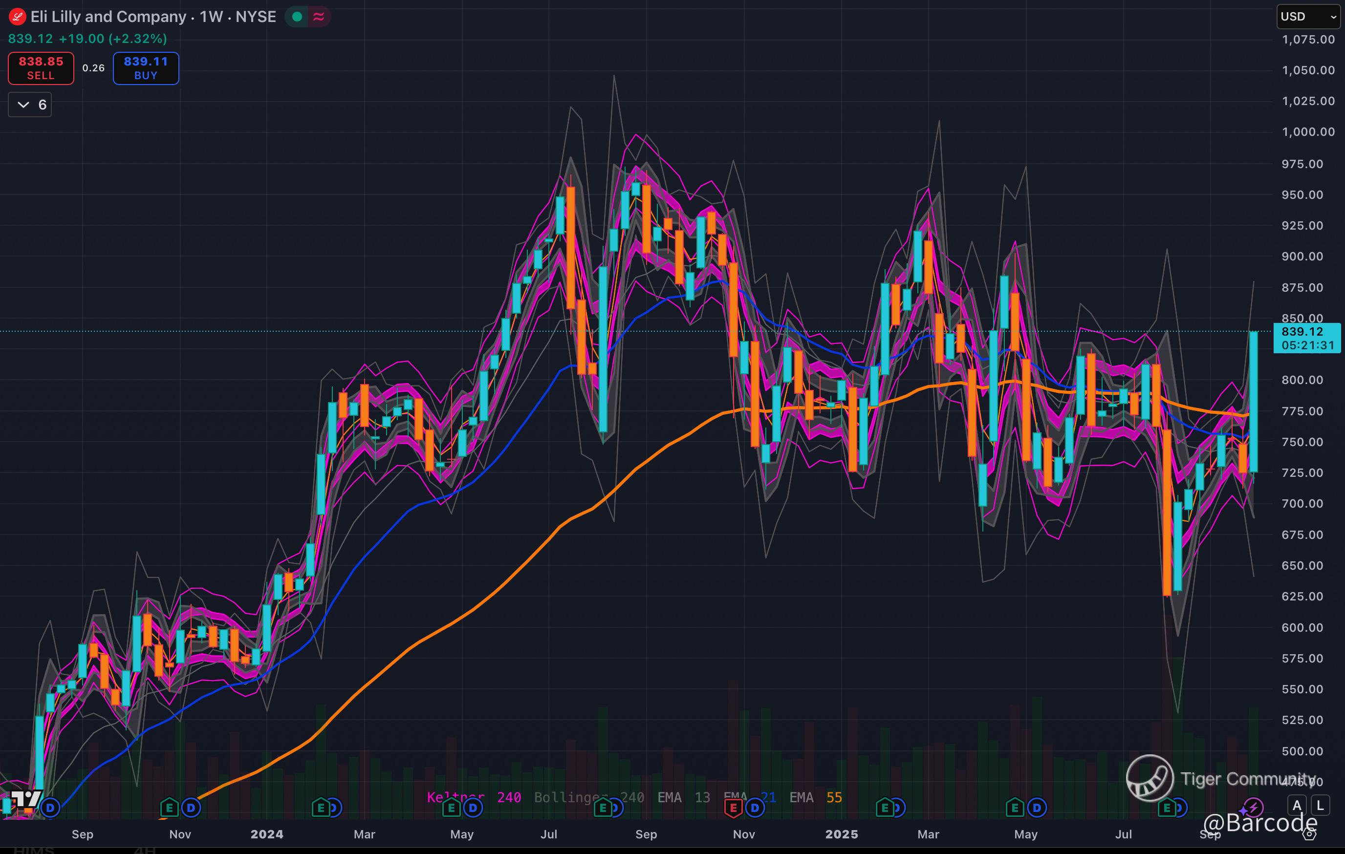 Technically, LLY has broken through a key descending trendline on the weekly timeframe, closing at $839.12 (+2.32%) after clearing a major volume shelf between 650–750. Price has reclaimed critical Keltner and Bollinger mid-band levels, with EMA 13/21 crosses starting to align in bullish formation. This is the first meaningful structural breakout since early 2024, and the chart suggests room to run toward the 850–950 zone if momentum persists.