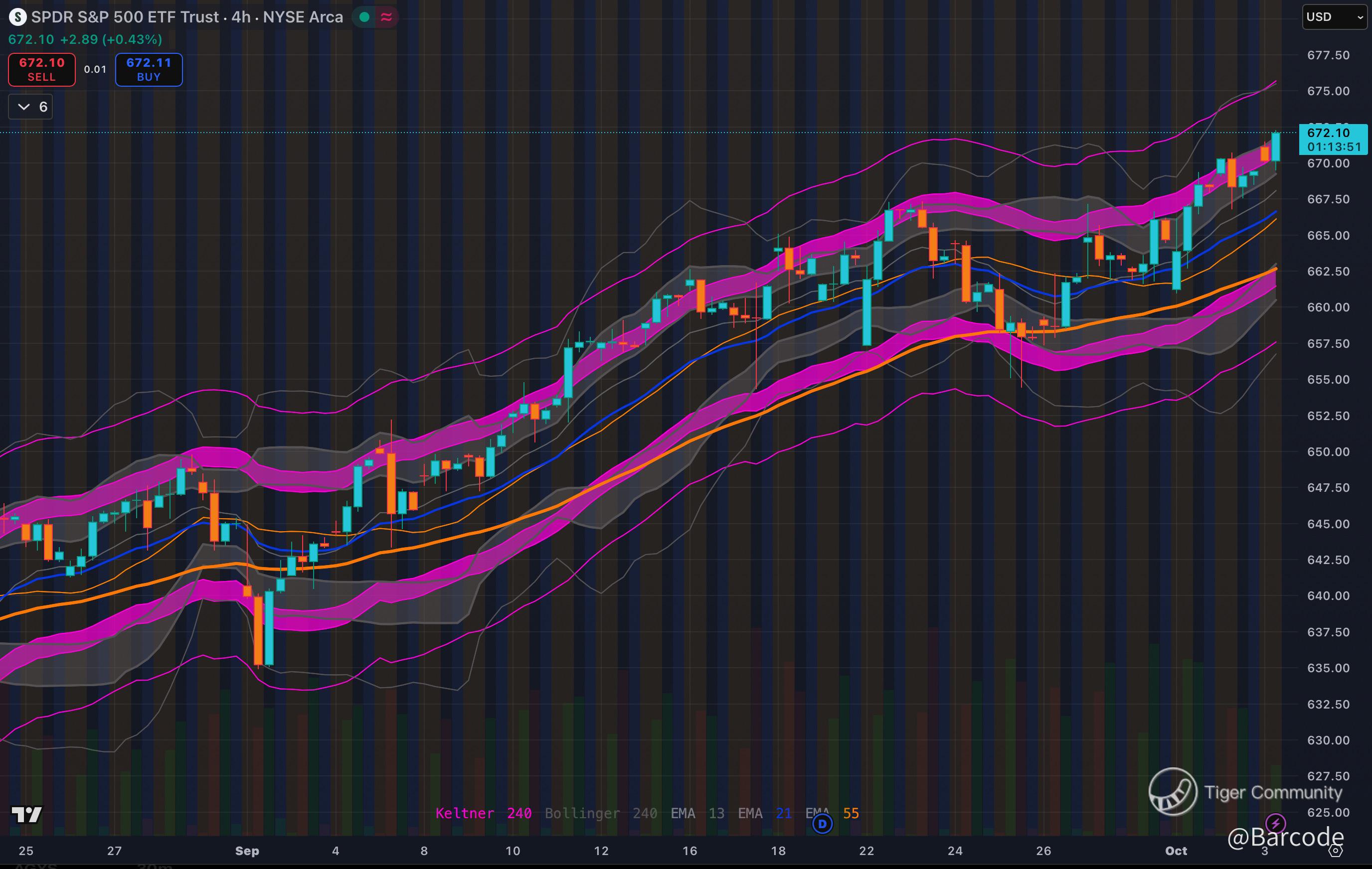 Technically, SPY is respecting its Keltner and Bollinger channels on the 4H timeframe, grinding along the upper band with price at 672.10. Morning gap fill action has played out cleanly. Range is clearly defined: 650 put support vs 670–675 call resistance. Expiry flows look set to be the dominant driver of short-term direction.