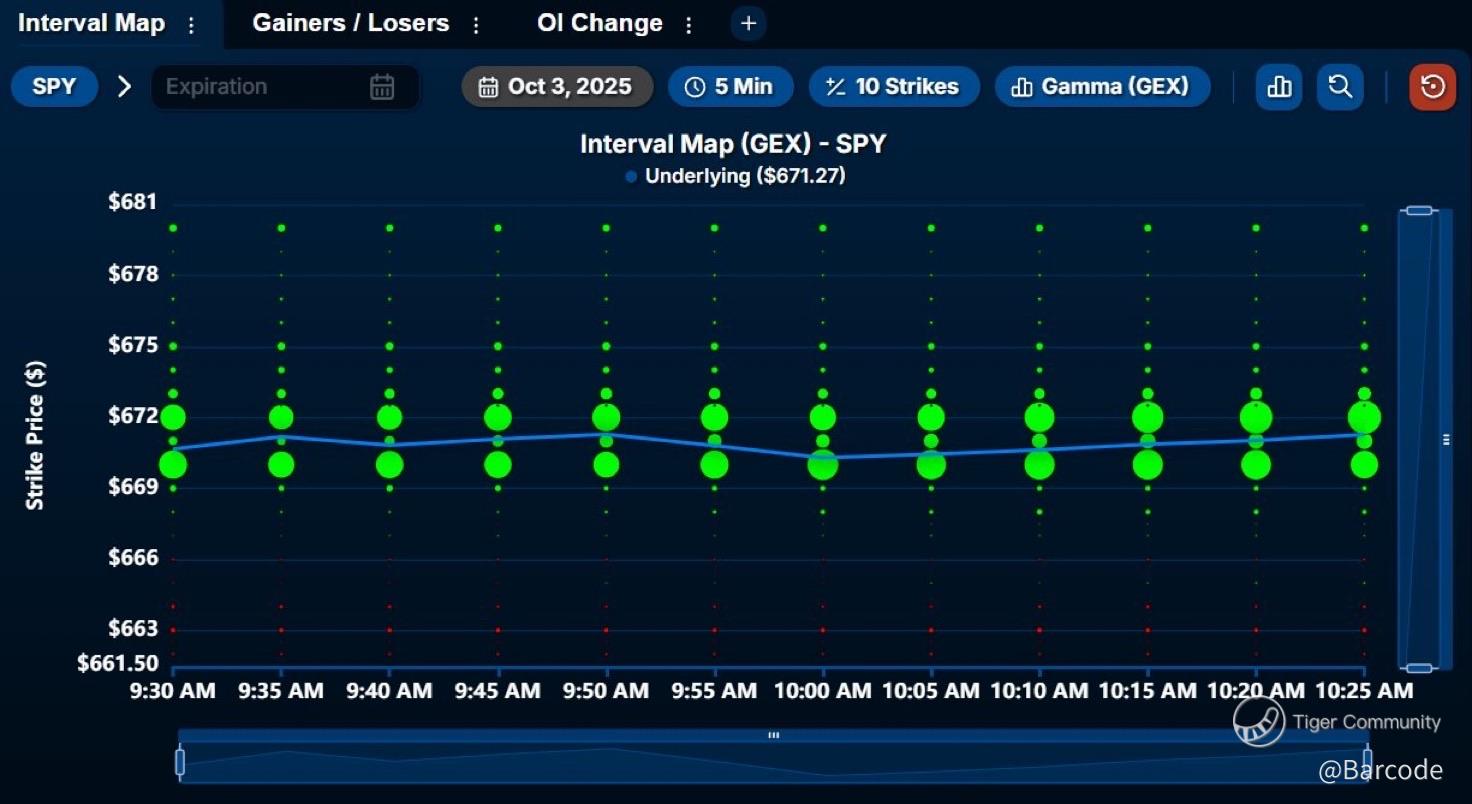 I’m watching SPY closely as elevated positive gamma exposure between 669 and 672 is acting like a gravitational band, pinning price within a tight intraday chop zone. You can see this clearly on the Interval Map where the largest GEX nodes cluster between 669 and 672, effectively dampening volatility for now.