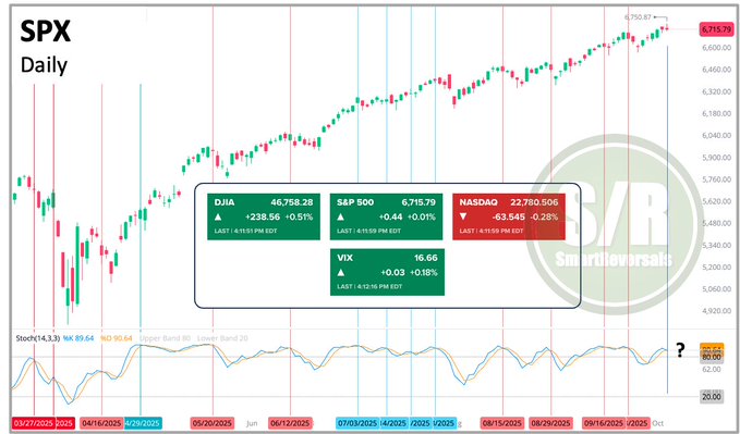 A chart displaying the S&P 500 daily performance with candlestick patterns and price movements. Below the chart, a smaller graph shows a technical indicator with lines. Text overlays include performance data for SPX, DOW, SAP 500, NASDAQ, and VIX, with percentage changes in green and red.