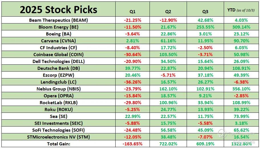 YTD, my 2025 picks are up a staggering +1322.8% in aggregate, powered by Nebius Group (+356%), Bloom Energy (+309%), Rocket Lab (+109%), and CVNA, Deutsche Bank, and Coinbase following close behind.