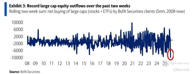 Bank of America recorded record outflows over the past fortnight. The chart shows the rolling two-week sum of net buying by BofA Securities clients, with the latest reading marking the sharpest large cap equity outflows since 2008. On the surface, this looks bearish. But historically, heavy outflows ahead of strong seasonal periods for sectors like banks often reflect late-cycle de-risking rather than structural weakness. If seasonal patterns in JPM, GS, and WFC repeat, this kind of flush could be the setup rather than the top.
