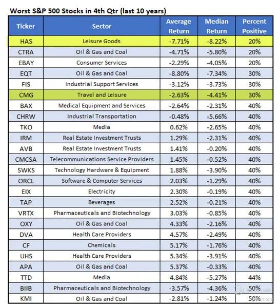 On the flipside, Hasbro (HAS) has one of the worst Q4 track records in the S&P 500, averaging –7.71% with just a 20% win rate, despite its holiday retail positioning. CMG appears again, reinforcing its seasonal headwinds.