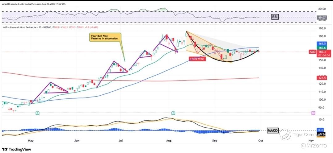 We will see that AMD rallied from early April into mid-August on a series of consecutive "bull-flag" patterns of trend continuance, as marked with purple diagonal lines above.
