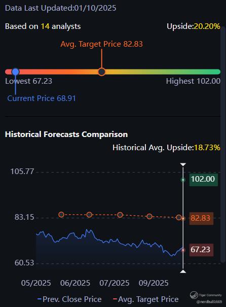 Based on 14 analysts from Tiger Brokers offering 12 month price targets for McCormick & Company in the last 3 months. The average price target is $82.83 with a high forecast of $102.00 and a low forecast of $67.23. The average price target represents a 20.20% change from the last price of $68.91.