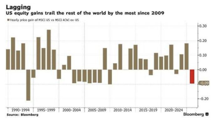 2.U.S. Stocks are underperforming the rest of the world by the largest margin since 2009