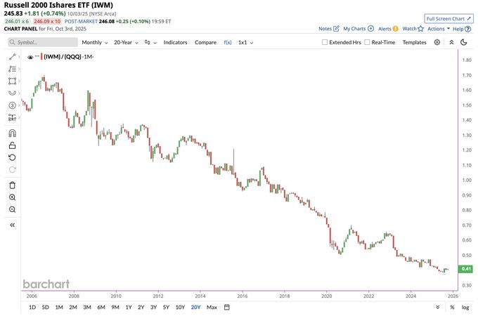 1.Small Caps $iShares Russell 2000 ETF(IWM)$ relative to the Nasdaq $NASDAQ(.IXIC)$ over the last 20 years.. basically just straight down, awful 📉📉📉