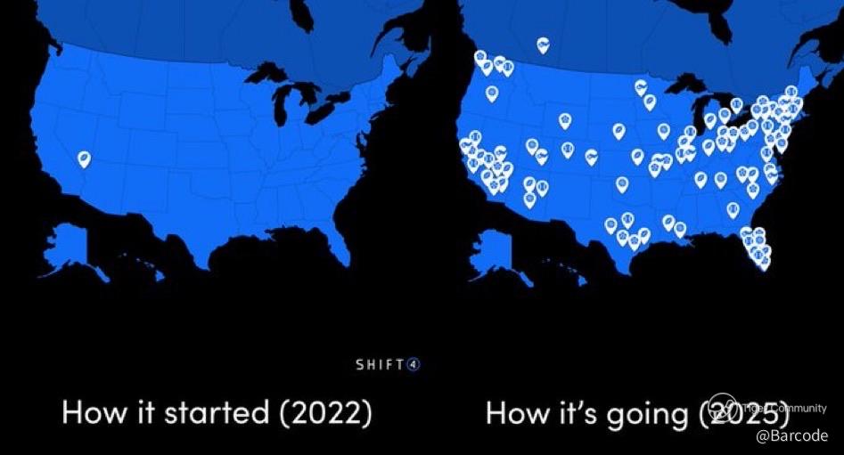 📊 The biggest names in sports and entertainment trust Shift4 $FOUR to power their venues. What started as a single partnership on the West Coast in 2022 has exploded into a nationwide footprint by 2025. The side-by-side maps tell the story: a single pin has multiplied into a dense constellation across stadiums, arenas, and entertainment hubs.