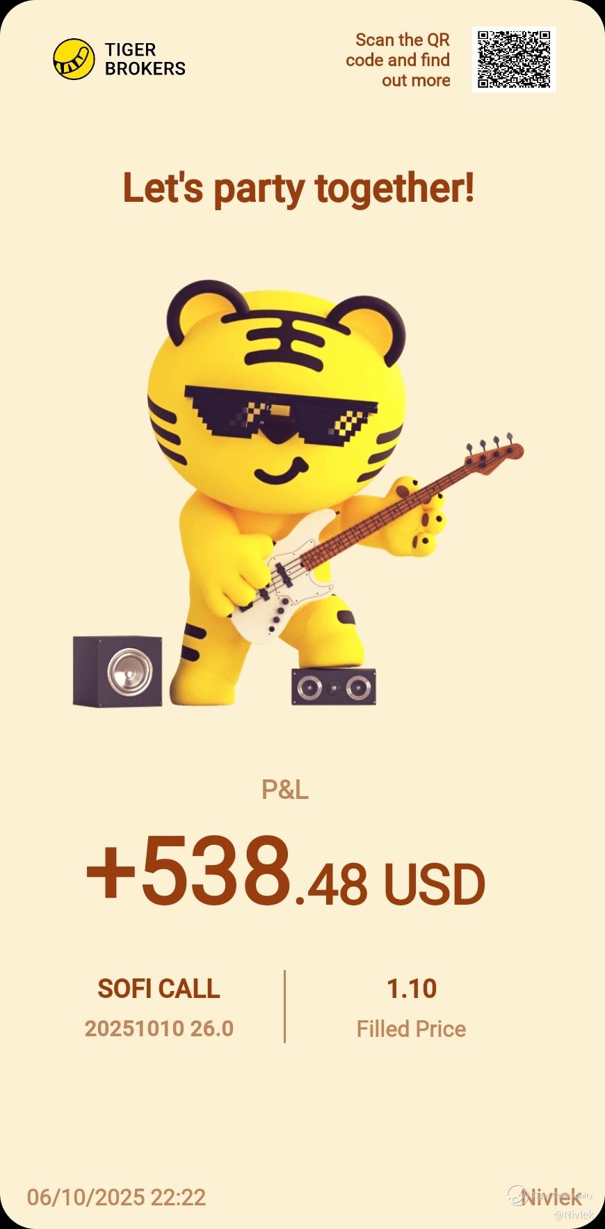 $SOFI 20251010 26.0 CALL$ Scalp some from the gold mine today. Market is volatile. Hit and run again[Cool]