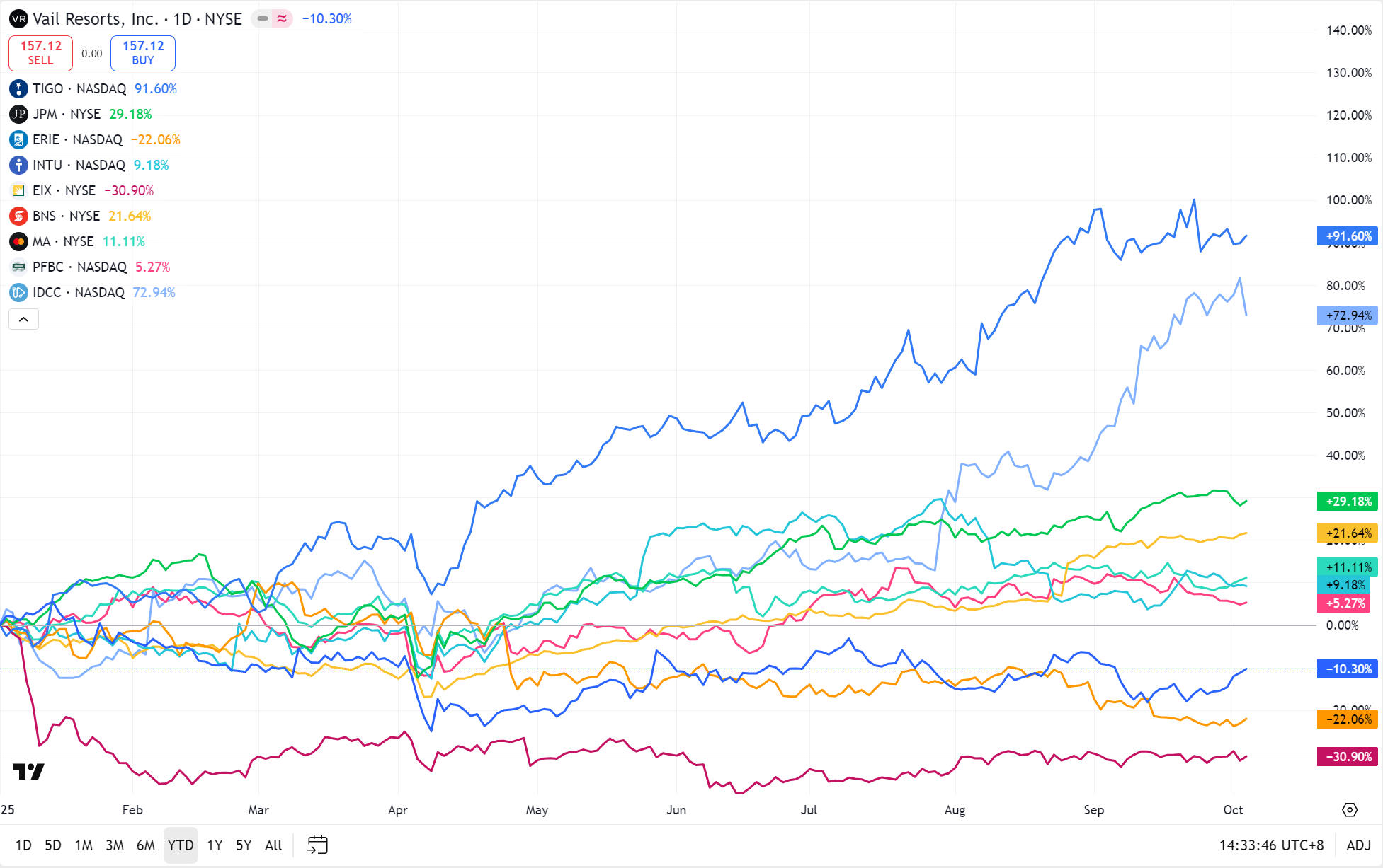 According to TradingView's 2025 data, a number of companies demonstrated positive performance including $Millicom International Cellular S.A.(TIGO)$ , $JPMorgan Chase(JPM)$ , $Intuit(INTU)$ , $Bank of Nova Scotia(BNS)$ , $MasterCard(MA)$ , $Preferred Bank(PFBC)$, and $InterDigital(IDCC)$ . In contrast, declines were observed for $Vail(MTN)$ , $Erie Indemnity(ERIE)$ , and $Edison(EIX)$ .
