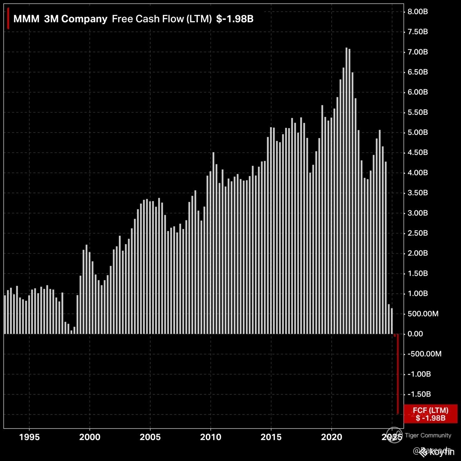 I’m staring at this chart and can’t help but feel like we’ve just witnessed a generational inflection point. 3M’s free cash flow has turned negative $1.98B on a trailing twelve-month basis. That’s not a typo. This is the first time in modern history that a company once considered a fortress of industrial stability has burned through cash at this scale. The drop isn’t just sharp; it’s vertical.