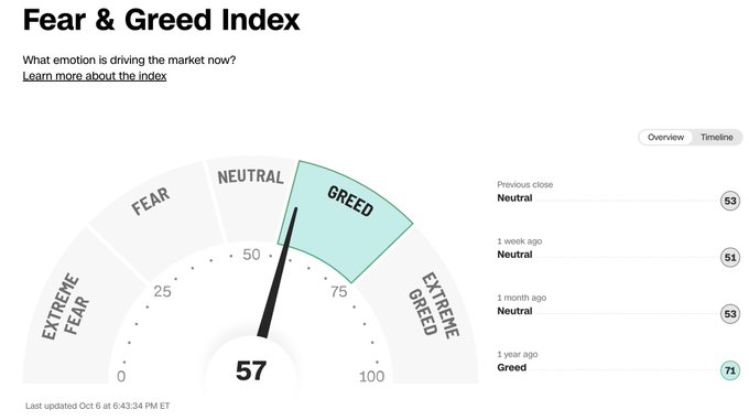 Circular gauge chart titled Fear and Greed Index with sections labeled Fear, Neutral, and Greed in green, blue, and green shades respectively, needle pointing to 57 in the Neutral to Greed area, scale from 0 Extreme Fear to 100 Extreme Greed, overview and timeline tabs visible, recent values like 53 Neutral Close, 54 Neutral High, 56 Neutral Low, and 71 one month ago displayed below