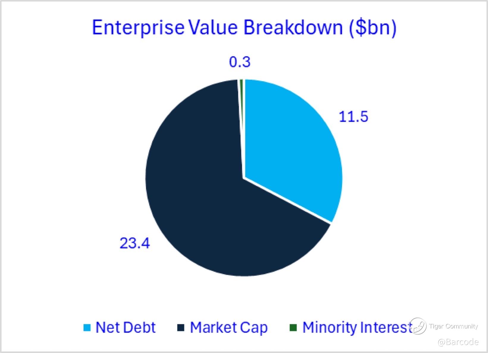 Current net debt represents ~32.7% of total Enterprise Value ($35.2bn) and 2.9× FY25 EBITDA ($3.9bn), which is material. Below is the breakdown of STZ’s Enterprise Value structure, showing $23.4bn in equity, $11.5bn in net debt, and $0.3bn in minority interest. This leverage profile makes $STZ particularly sensitive to macro rate expectations and capital allocation shifts.