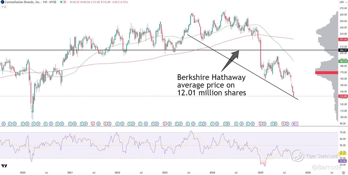 Technically, the chart shows $STZ breaking well below Berkshire’s cost basis, currently trending near multi-year descending resistance. The market’s reaction post-earnings will be closely watched to see whether this zone evolves into a longer accumulation phase or continues to reflect fundamental headwinds.