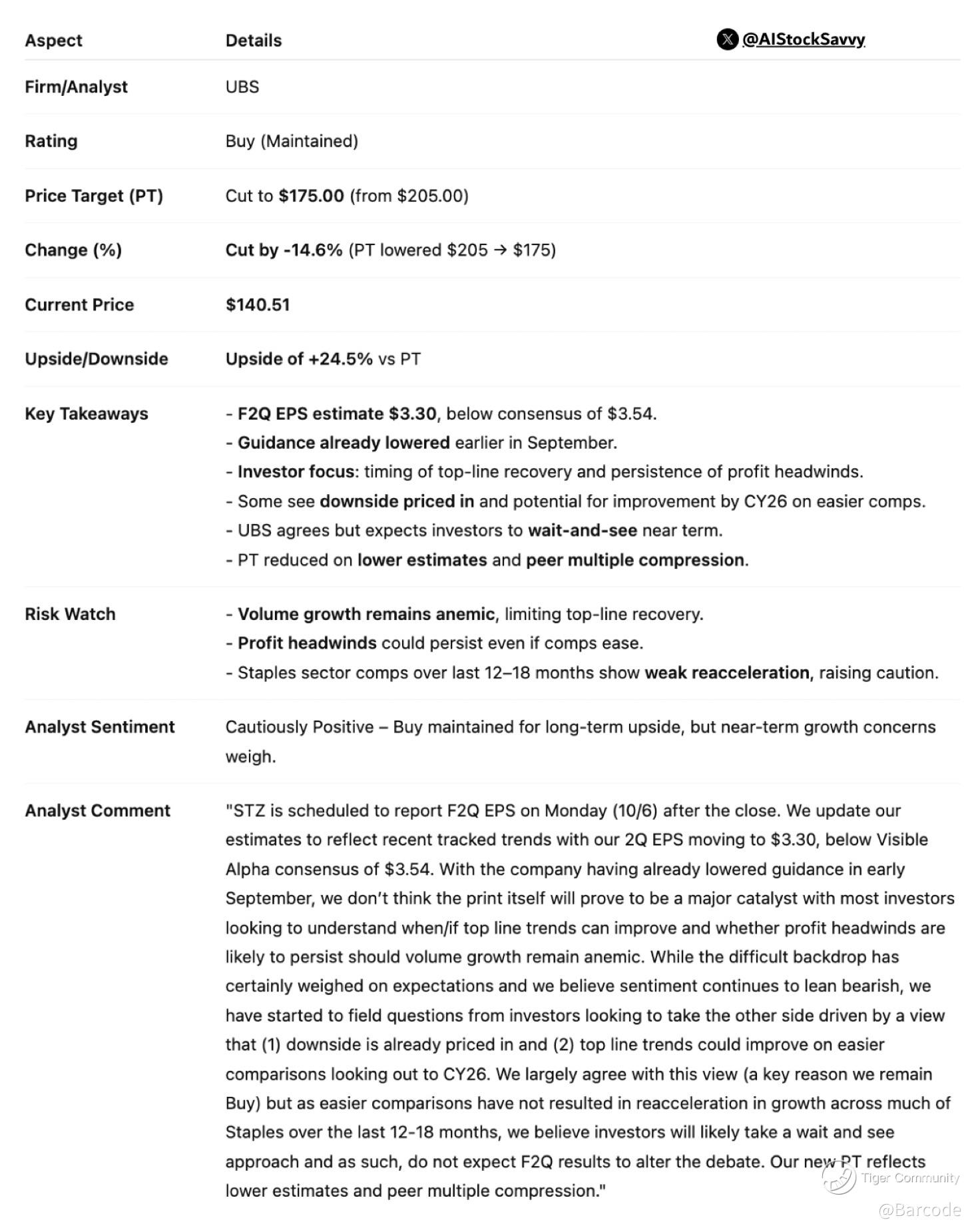 STZ reports Q2 FY26 results post-market on 06Oct25. Consensus expects $3.40 EPS on $2.5 B revenue, compared with $3.22 EPS and $2.52 B revenue in Q1. UBS sits below the street at $3.30 EPS and has trimmed its price target from $205 to $175 (still +24.5% upside from $140.51), citing muted volume trends and profit headwinds.