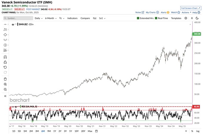 3.Semiconductor Stocks $VanEck Semiconductor ETF(SMH)$ hit most overbought level in 8 years