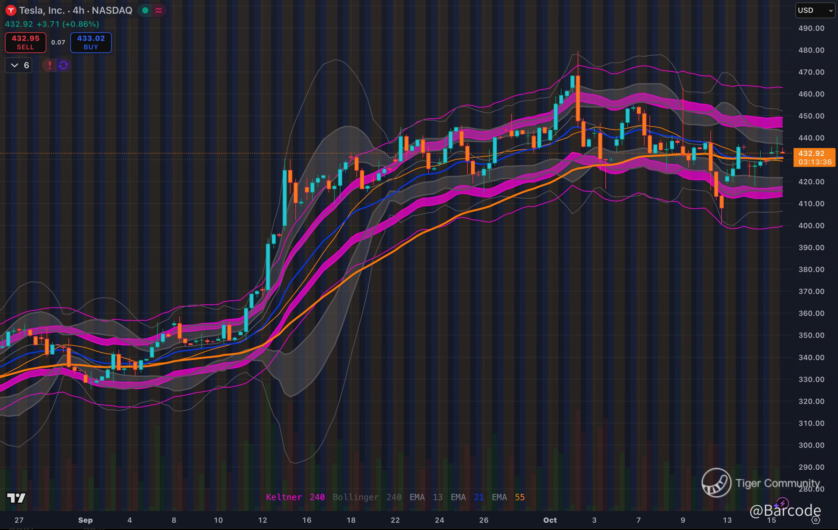 $TSLA is locked in a Bollinger Band squeeze, coiling between $420 and $450 on the 4H. Volatility is tightening fast, and history shows these setups rarely stay quiet for long.