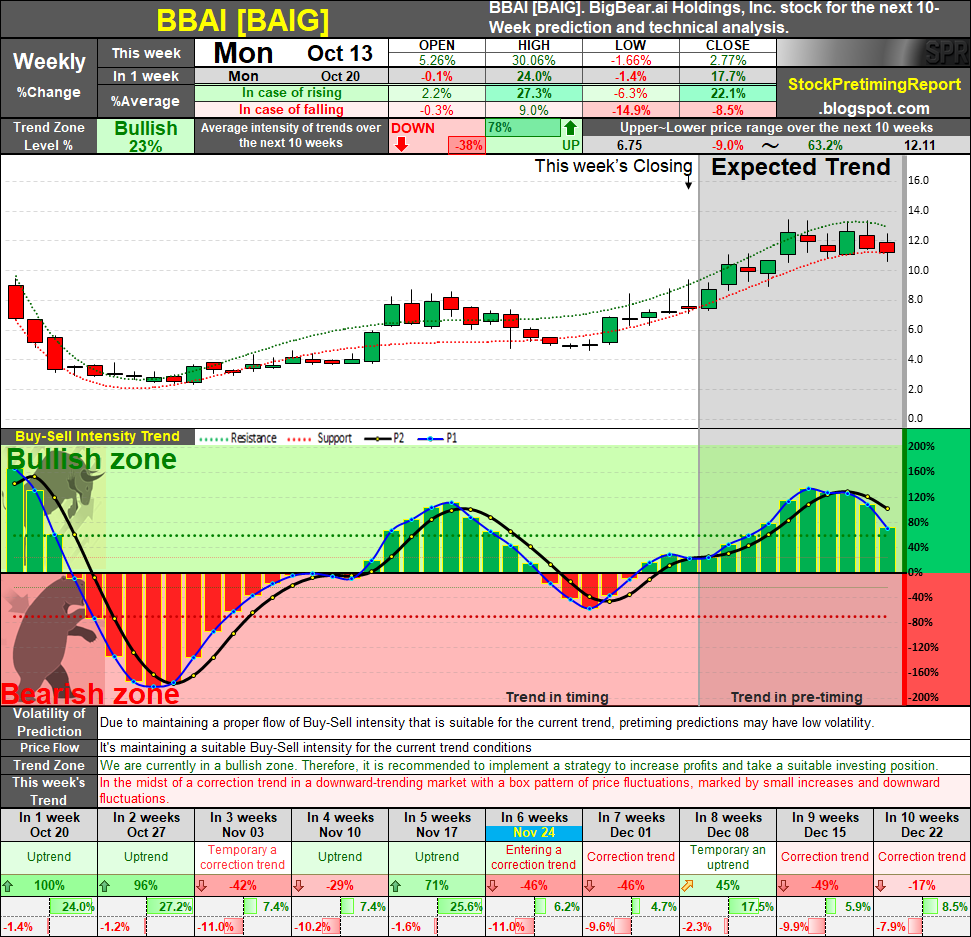 BBAI remains in a Bullish trend, with short-term corrections providing strategic buying opportunities. The 10-week forecast anticipates a median gain of +27.1%, supported by strong upward intensity and low predicted volatility. Investors should hold positions, accumulate tactically, and capitalize on continued upward momentum, remaining mindful of minor short-term fluctuations.