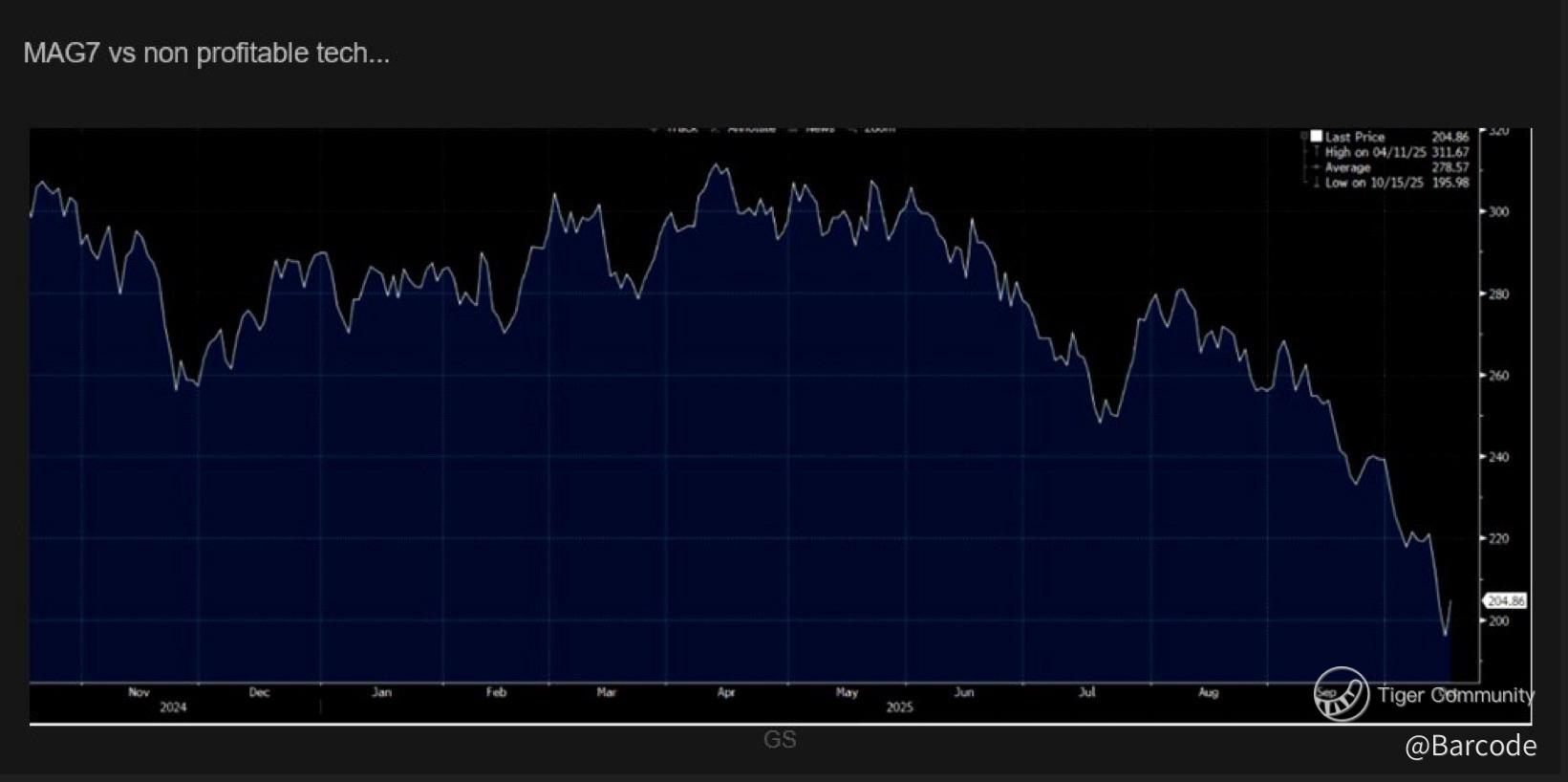 That Goldman Sachs ratio peaked at 311.67 in April 2025 and has now cratered to 204.86. Itβs a textbook late-cycle bleed as liquidity tests its limits and momentum splinters. Quality is under-owned, beta is over-loved. Iβm watching this carefully because itβs exactly how leadership transitions before volatility spikes.