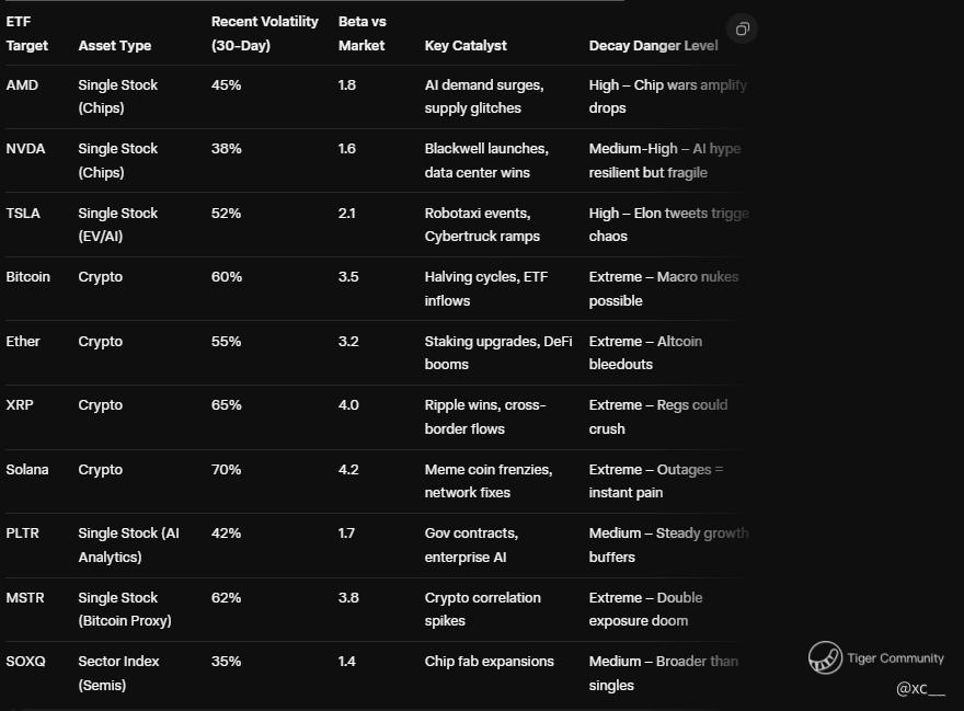 Bubble alert: Absolutely, this 5x surge reeks of AI mania peaking. With NVDA, AMD, PLTR, and TSLA dominating the list, it's like pouring jet fuel on overhyped sectors where valuations already defy gravity – think trillion-dollar market caps built on AI promises that haven't fully materialized. Crypto inclusions like SOL and XRP amp the speculation, echoing 2021's froth where leverage amplified booms and busts. If AI hype deflates (hello, capex slowdowns or tech layoffs), these ETFs could accelerate the pop, turning portfolios into confetti. But for short-term scalpers, it's a playground: Ride the momentum waves, but bail before the tide turns – holding multi-day exposes you to decay where even sideways action bleeds value.
