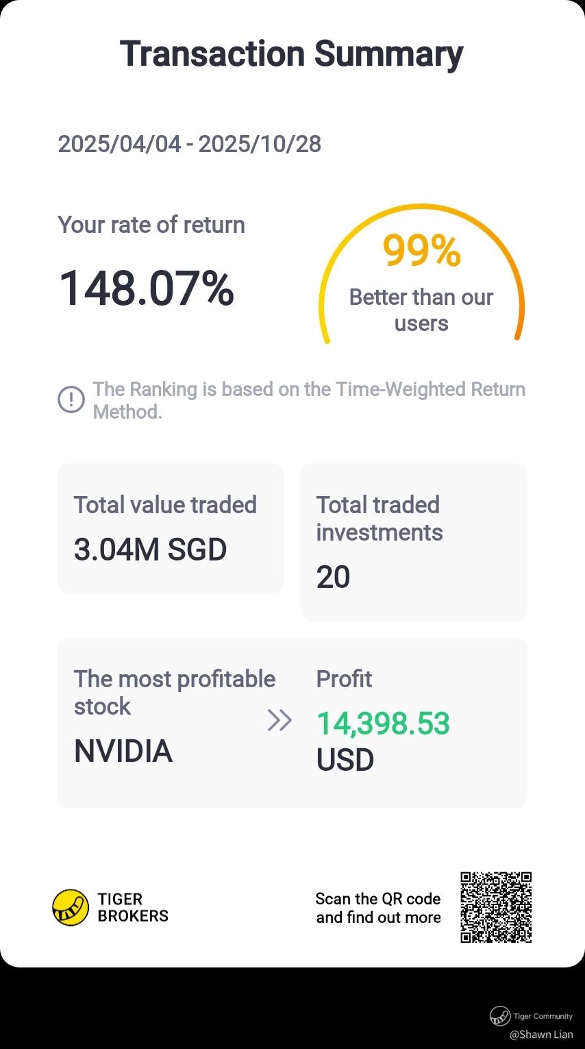 Grateful for an incredible run this year — 148% rate of return, ranking in the top 1% of Tiger Brokers users. 💪