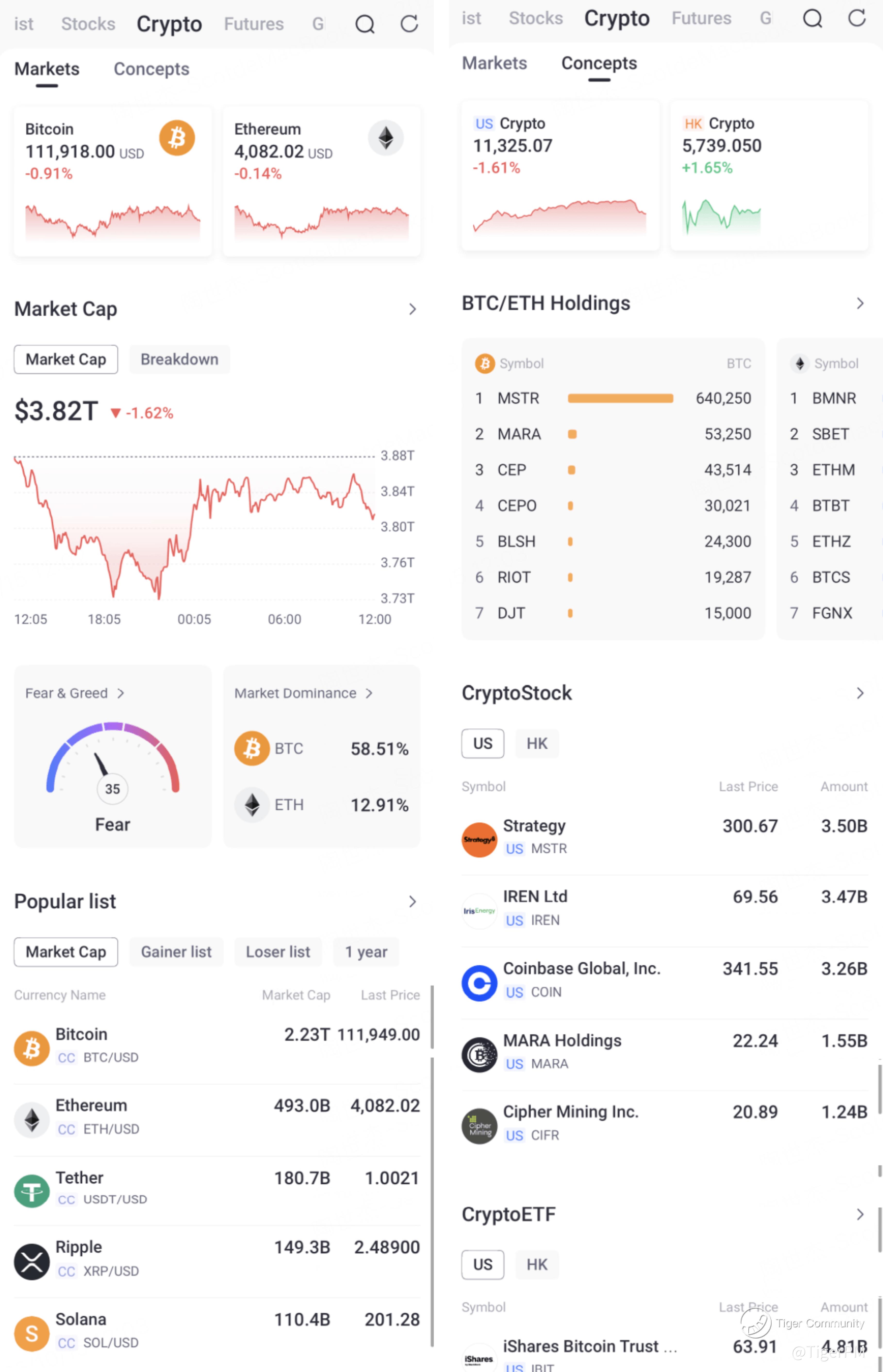 [New] The Crypto-Market page provides macro-level data such as Total Market Capitalization and BTC Dominance, helping users intuitively grasp overall market dynamics and trends. The Crypto-Concepts page features unique leaderboard data on BTC/ETH Holdings, enabling users to identify investment opportunities and understand risk exposure.