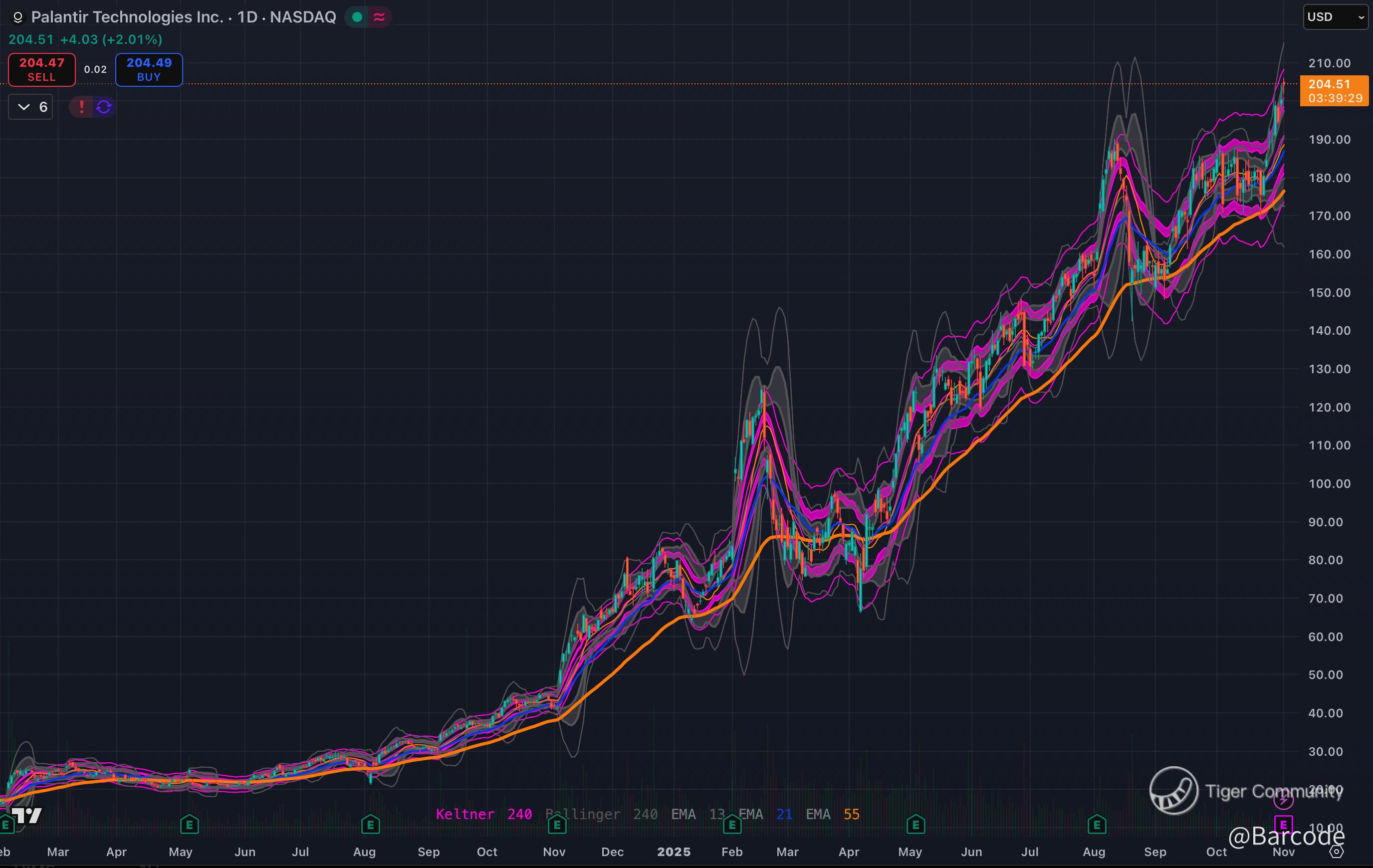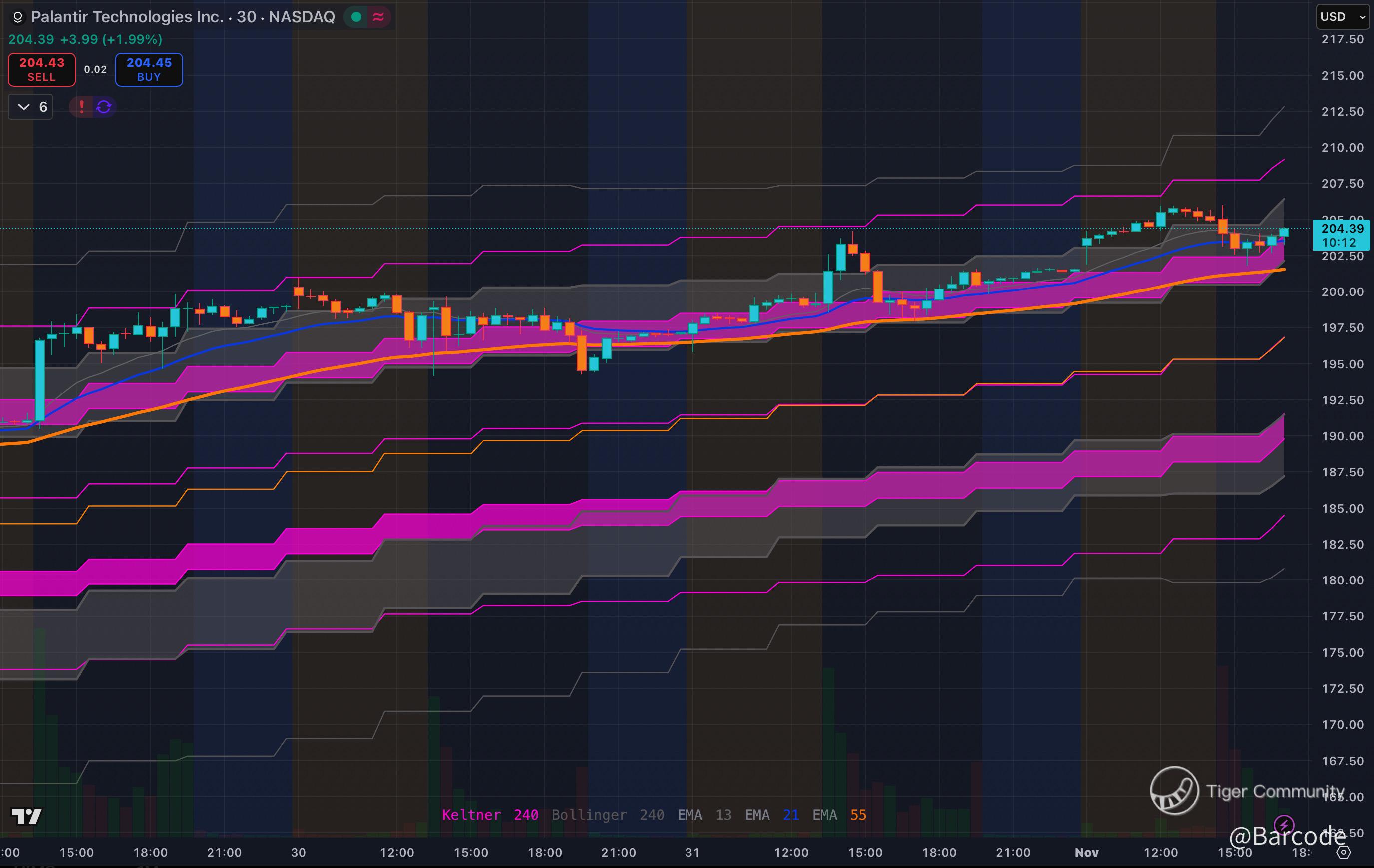 At $204.51, price rides well above the 13-week EMA ($182), 21-week ($165), and 55-week ($128). RSI(14) at 72 shows persistent strength, while MACD histogram expands to 4.2, its widest since July. Bollinger Bands are tightening, upper band near $208; a close above activates my breakout model targeting $222. Keltner Channels are widening, confirming momentum acceleration. Hourly chart shows an ascending triangle resolving upward, with $200 as pivot support. Entry: $201β$203 dips. Stop-Loss: $194 (below VWAP cluster). First Target: $214. Stretch: $230, aligning with Wedbushβs PT. If post-earnings gap-up occurs, Iβll trail stops to $205 and ride trend continuation.