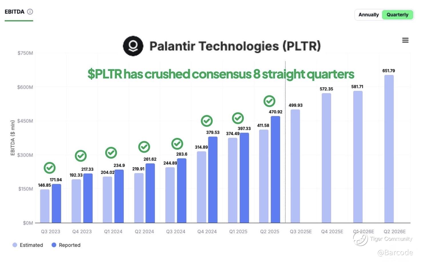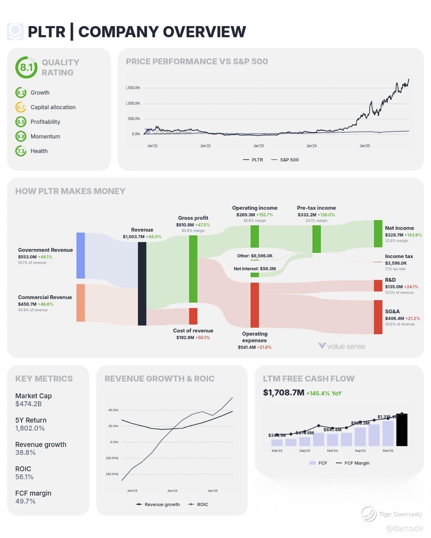 Q2 delivered $1.004 billion in revenue, up 48% year-over-year, alongside GAAP EPS of $0.16, a 77% increase. Net income reached $326.7 million, while U.S. Commercial revenue exploded 93% to $494 million, driven by AI Platform (AIP) adopters among Fortune 500 firms. Government revenue grew 53% to $510 million, anchored by multi-year defence contracts. Adjusted operating margins expanded to 41%, and free cash flow jumped 145% to $1.7 billion annually. Iβm projecting Q3 to mirror this; consensus $1.09 billion revenue could push $1.12 billion if commercial deal momentum continues. Rule of 94 scores 135, placing Palantir among elite hyper-growth names. Cash reserves exceed $4.1 billion with zero debt, and a $1 billion buyback authorisation adds capital flexibility.
