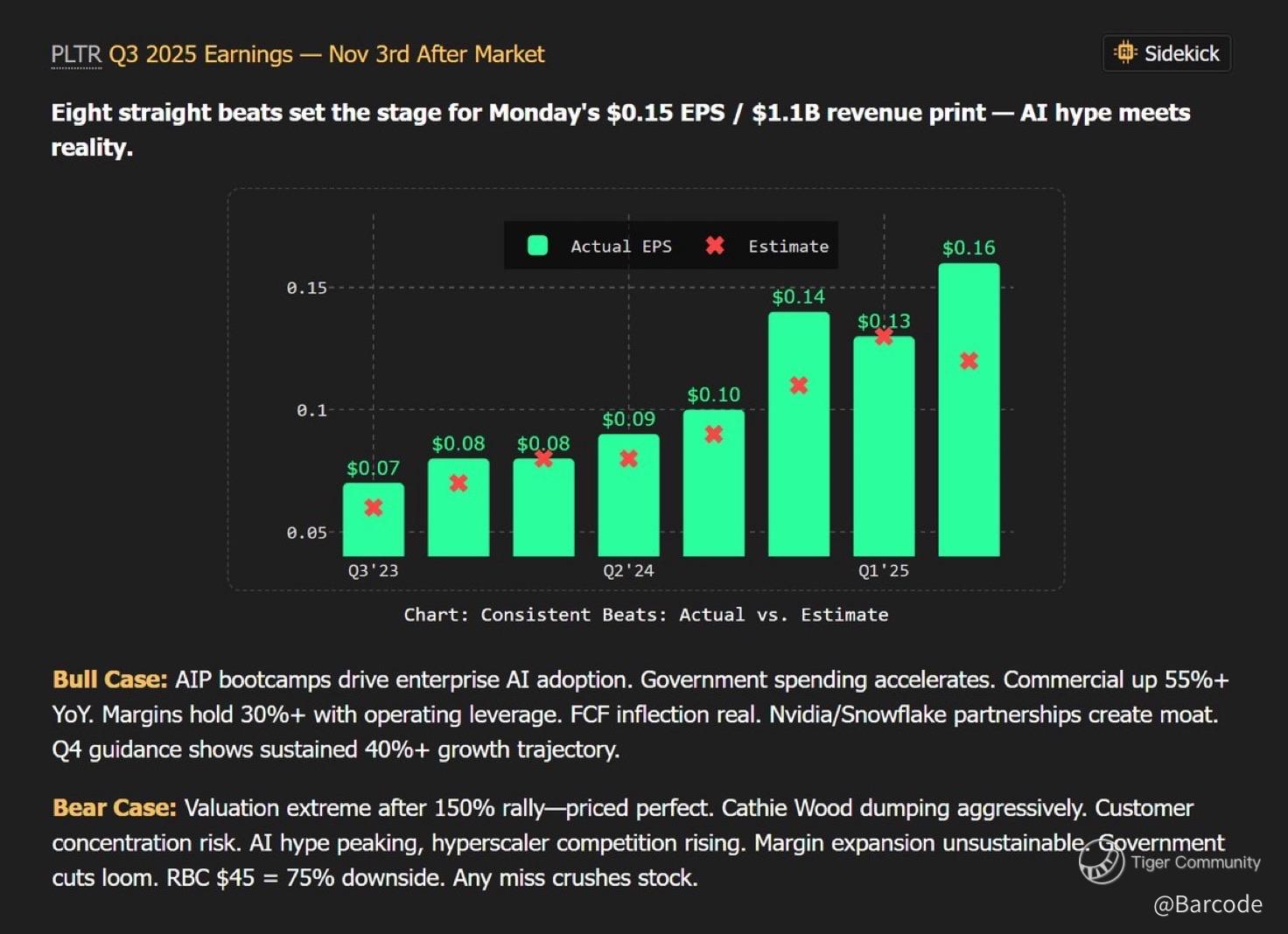 Iβve spent over twenty years dissecting market cycles, and right now, Palantir stands at a pivotal crossroads that screams opportunity. Tonightβs Q3 earnings release isnβt just another quarterly update; I see it as the catalyst for Palantir to deliver its ninth straight EPS beat, fuelled by explosive AI demand and ironclad execution. Polymarket odds sit at 86% for an upside surprise, backed by $3.2 million in whale call sweeps recorded today on unusual options activity scanners. Street consensus pegs EPS at $0.17 on $1.09 billion revenue, implying 48% year-over-year growth, but Palantirβs track record of smashing estimates by an average of 12% over the last eight quarters has me convinced theyβll overdeliver again. Current price hovers at $204.51, up 2.1% pre-market, with RSI at 72 signalling sustained strength without overbought exhaustion. Nvidiaβs Jensen Huang called them βthe most important enterprise software company,β and Iβm positioned early because this print could validate Palantir as the AI infrastructure kingpin amid surging defence budgets and enterprise digital transformation.