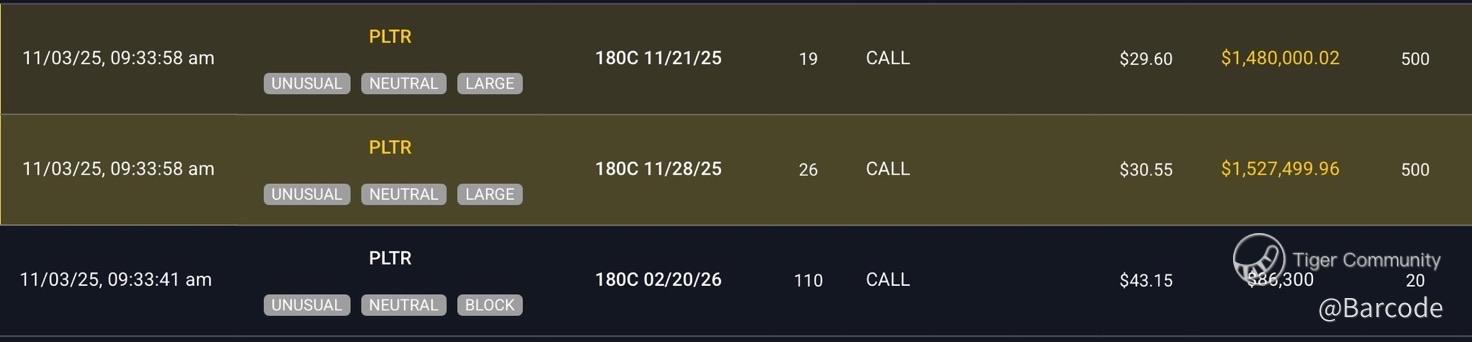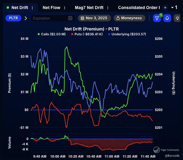 Wedbushβs Dan Ives lifted his target to $230, branding Palantir an βAI juggernautβ and forecasting a trillion-dollar market cap by 2028 as AIP expands toward 1,000 enterprise clients. Loop Capital initiated coverage at $220, citing new $480 million defence AI contracts. Citadel and Renaissance Technologies added 2.1 million shares in Q3 filings, boosting institutional ownership to 62%. Hedge fund positioning strengthens conviction: Tiger Global lifted its stake by 18% quarter-over-quarter. Options data show $3.2 million in net call premium with the 180C and 190C strikes dominating volume; put/call ratio sits at 0.42, its lowest in six months. Goldman Sachs projects $2.5 billion in commercial AI revenue by 2026, a 55% CAGR that I see as achievable.