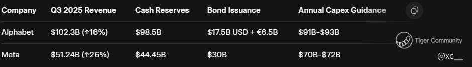 $Alphabet(GOOG)$ $Meta Platforms, Inc.(META)$ Ever wondered if giants like Alphabet and Meta are scraping the barrel for cash? Spoiler: they're not! 😎 These powerhouse moves into massive bond sales are all about smart strategy amid skyrocketing AI demands. Alphabet just unleashed a whopping $17.5 billion in U.S. dollar bonds plus €6.5 billion in euro bonds, drawing insane demand—think $90 billion for the dollars alone. Meta topped that with a record-smashing $30 billion bond deal, peaking at $125 billion in orders. But is this desperation or domination? Let's dive deep with fresh numbers up to November 4, 2025, and unpack if it's time to snag that dip or dash for the exits. 📊🔥