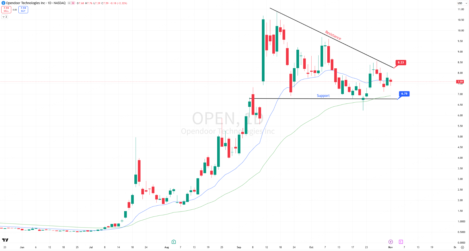 Opendoor Technologies closed at $7.59, down 2.32% on the day and sitting about 30% below its 52-week high near $10.87. Volume (~87M) was well under the ~267M average, pointing to orderly consolidation rather than capitulation.