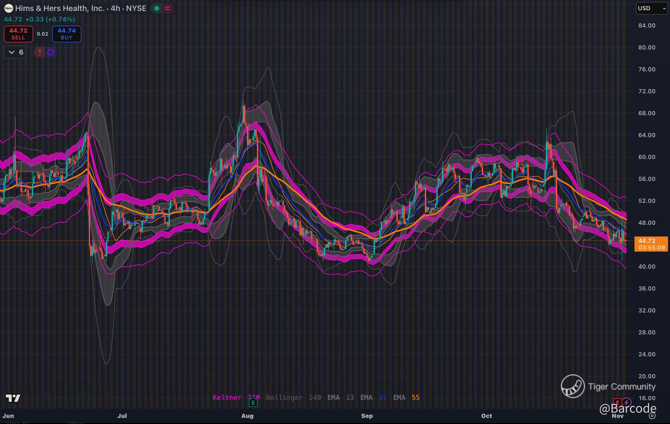 HIMS is coiling within a descending wedge from the $73 February peak and testing the lower Bollinger Band near $45. Support sits at $44 (primary) and $40 (secondary). Resistance zones $50 and $60 align with Fibonacci levels. RSI 55–60 and curling up from oversold, MACD histogram turning positive on 4-hour chart. Keltner channels contract since October, priming for a volatility expansion. A close above $47.31 confirms breakout; volume > 1.5× average validates. Trade plan entry $44–$46, stop $38, base target $60, stretch target $80+.
