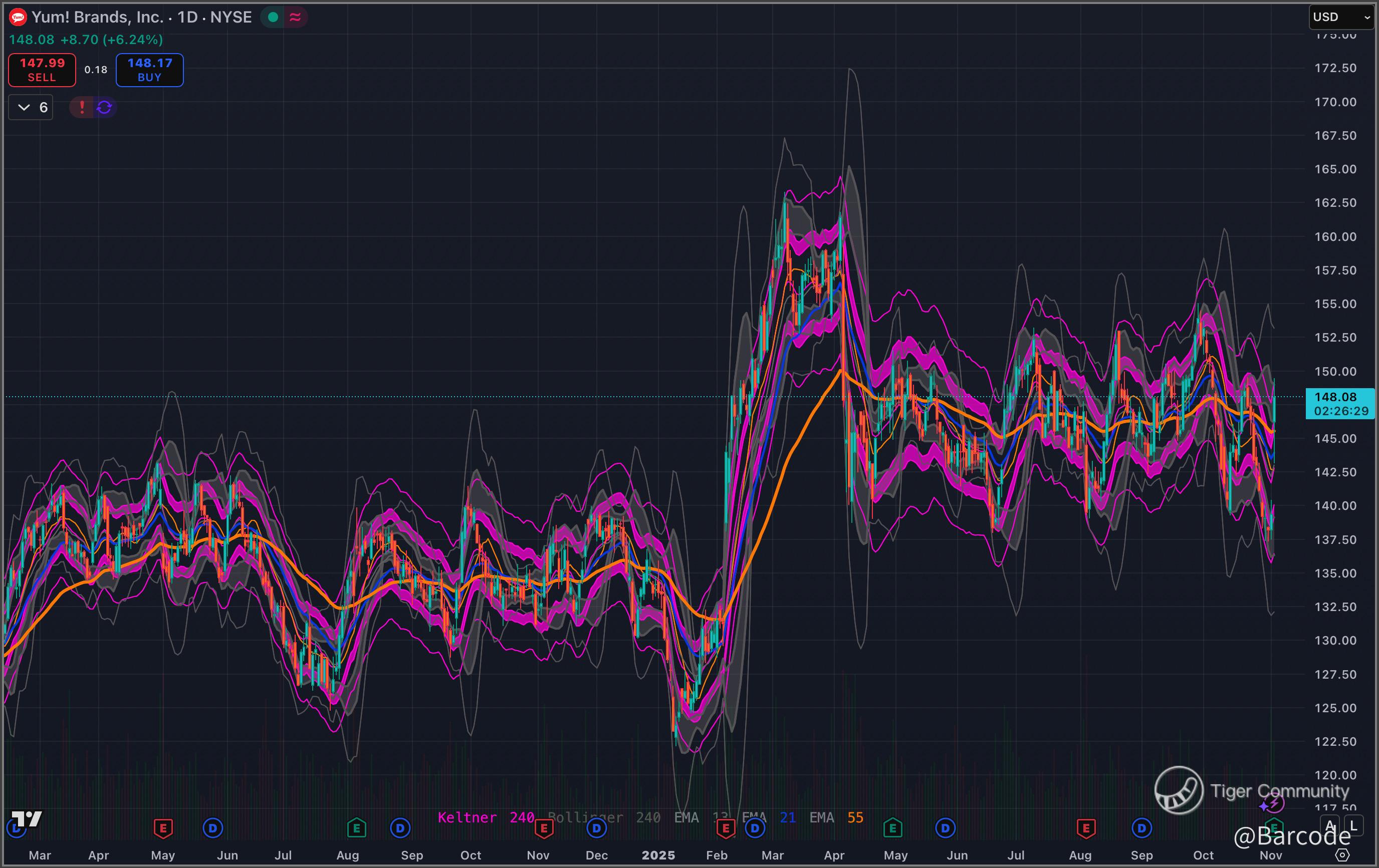 I’m glued to the charts because price action confirms fundamentals. On the daily timeframe, $YUM cleared a multi-month consolidation triangle with a measured move targeting $158; the 21 EMA crossed bullishly over the 55 EMA on 4 November, volume 2.1 times 50-day average. Keltner Channel expansion signals volatility breakout; upper band now $152.40. RSI at 64 avoids overbought territory, MACD histogram flipped positive with widening spread. Key levels I’m tracking: