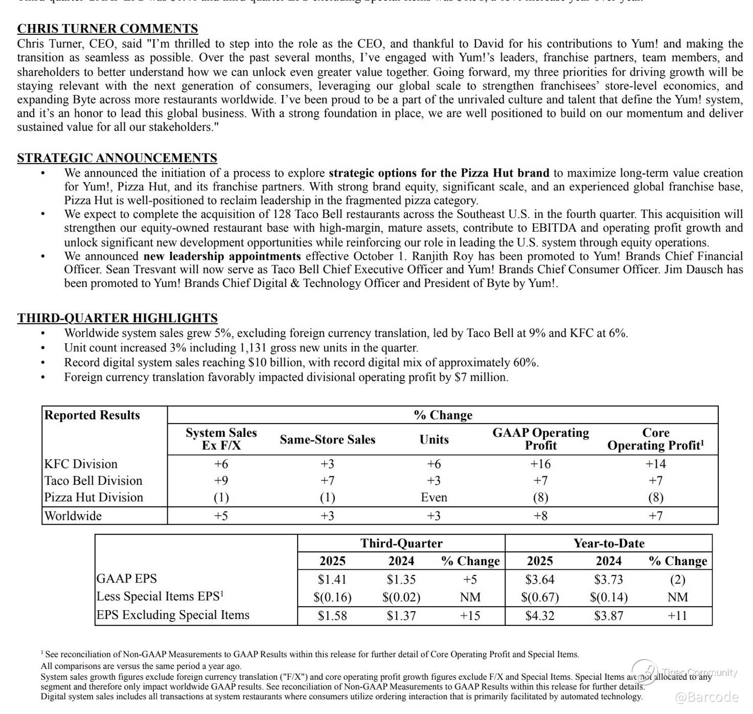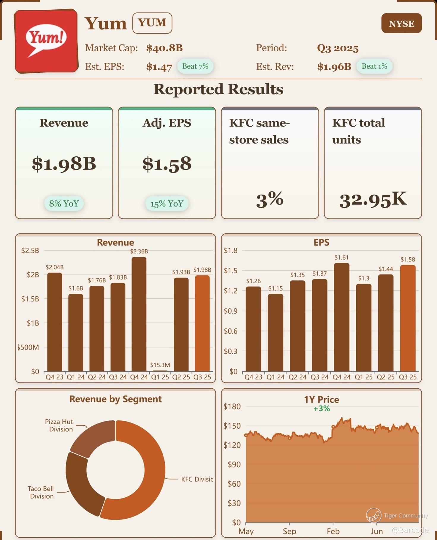 I’m positioning Yum! Brands ($YUM) at the inflection point of a multi-year transformation, where decisive portfolio pruning meets accelerating digital and franchise leverage. The Q3 2025 earnings release on 4 November 2025 delivered a textbook beat-and-raise moment: revenue climbed to $1.98 billion, up 8 % year-over-year and $20 million above consensus; adjusted EPS hit $1.58, a 15 % jump that cleared the $1.47 estimate by 7.5 %. System-wide sales grew 5 % excluding currency effects, same-store sales rose 3 %, and net unit expansion added 1 131 locations, pushing the global footprint past 62 000 restaurants. Digital orders shattered records at $10 billion, now representing roughly 60 % of mix, a metric I track religiously because it directly correlates with higher average tickets and lower labour intensity.