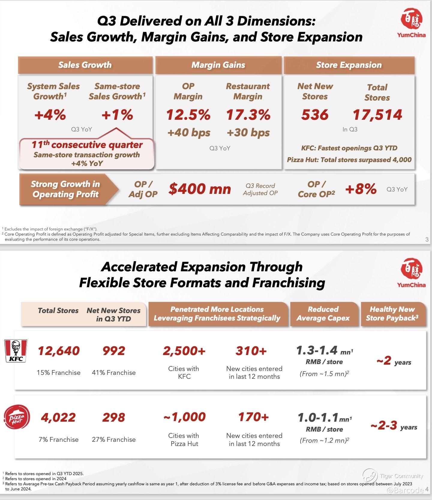 • KFC Division: $1.05 billion equivalent contribution (inferred from segment profit weighting), up 6 % ex-FX, with 14 % core operating profit growth to $342 million; unit count now 32 950, adding 842 net new doors year-to-date.